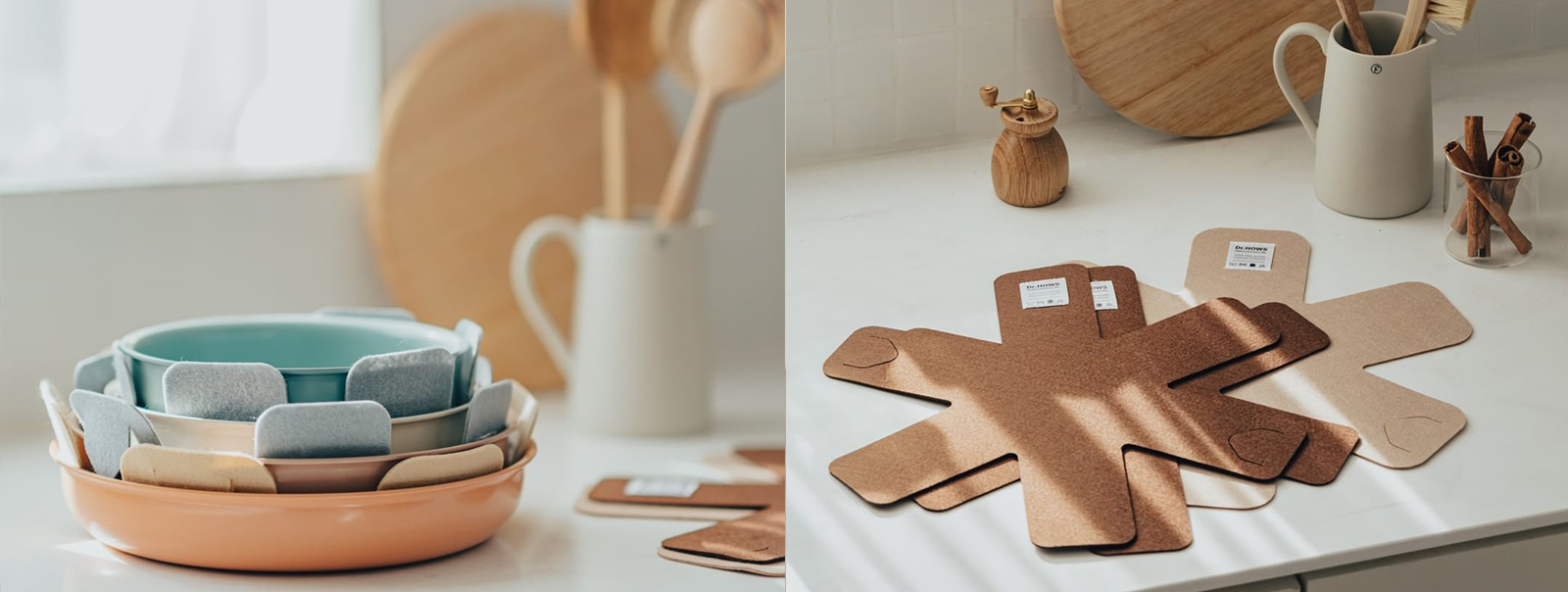 不只是炒鍋、平底鍋、湯鍋等廚具,疊放收納易碎碗盤時,也可以使用不織布保護墊安全保護廚具用品不被刮傷。
