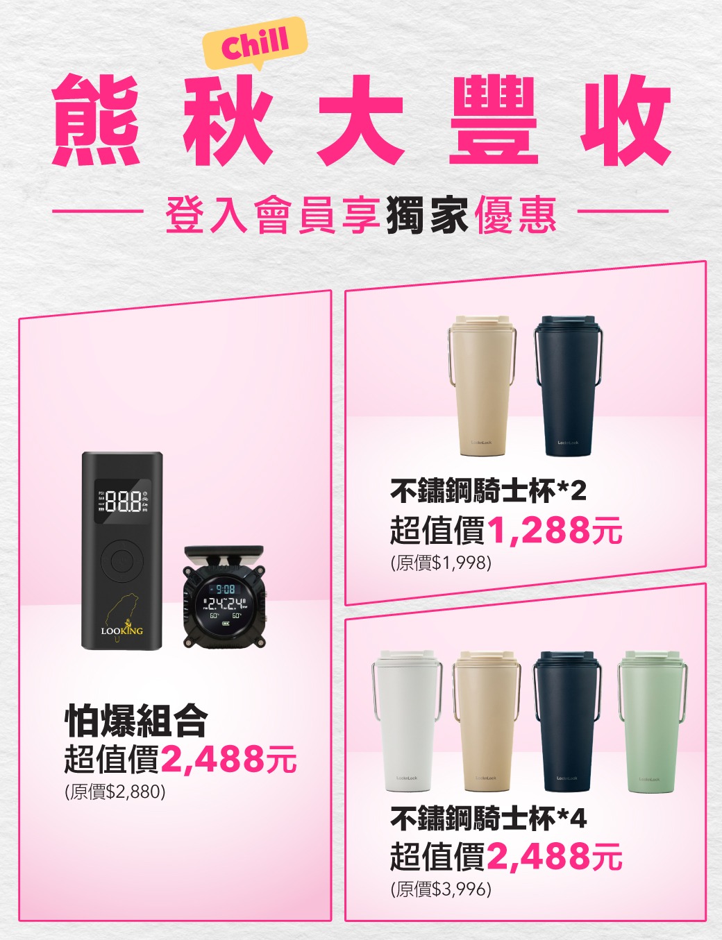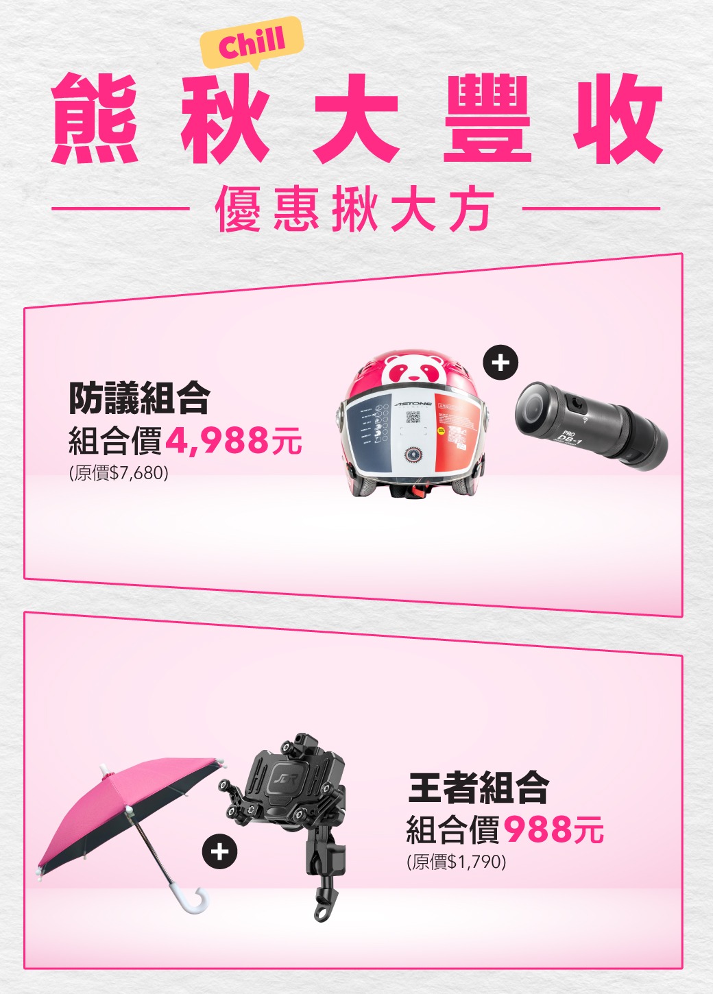 2023-09-04 16:55 熊秋(chill)大豐收 組合優惠價| 防議組合 品牌ASTONE安全帽 *1 點此搶購>>>DB-1 Pro 行車紀錄器 *1 點此搶購>>> 王者組合 JDR手機架(變形金剛款) *1點此搶購>>> 大振豐手機晴雨傘 *1點此搶購>>> 注意事項:活動商品數量有限,售完為止新夥伴優惠品項不在此活動範圍內會員獨家優惠| 怕爆組合(MS-7太陽能胎壓偵測器+多功能智慧打氣機) 熊安心行車組合 點此搶購>>> 微笑騎四杯(奶油霜白、蜂蜜奶油黃、梵谷星空藍、抹茶白玉綠)不鏽鋼騎士杯 (四色任選) 點此搶購>>> 注意事項:活動優惠需登入會員活動商品數量有限,售完為止